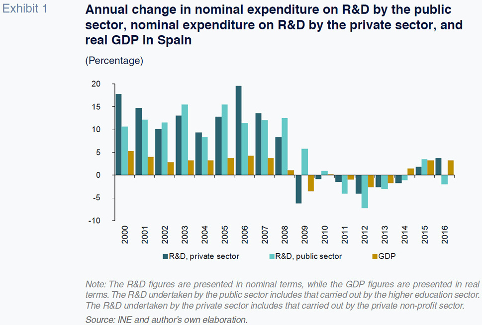 The decoupling of public and private R&D expenditure in 2016 could mark a very worrying shift in relation not only to the past but also compared to Spain’s peer economies.