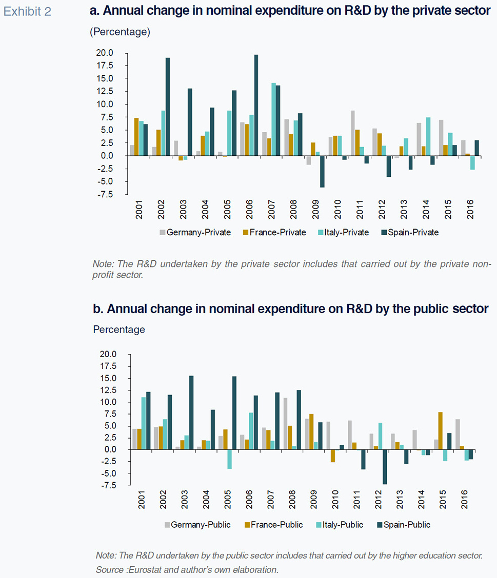 Exhibits 2.a and 2.b, respectively, depict these movements in R&D expenditure by the private and public sectors for Spain and the rest of the major eurozone economies (Germany, France and Italy) between 2001 and 2016.