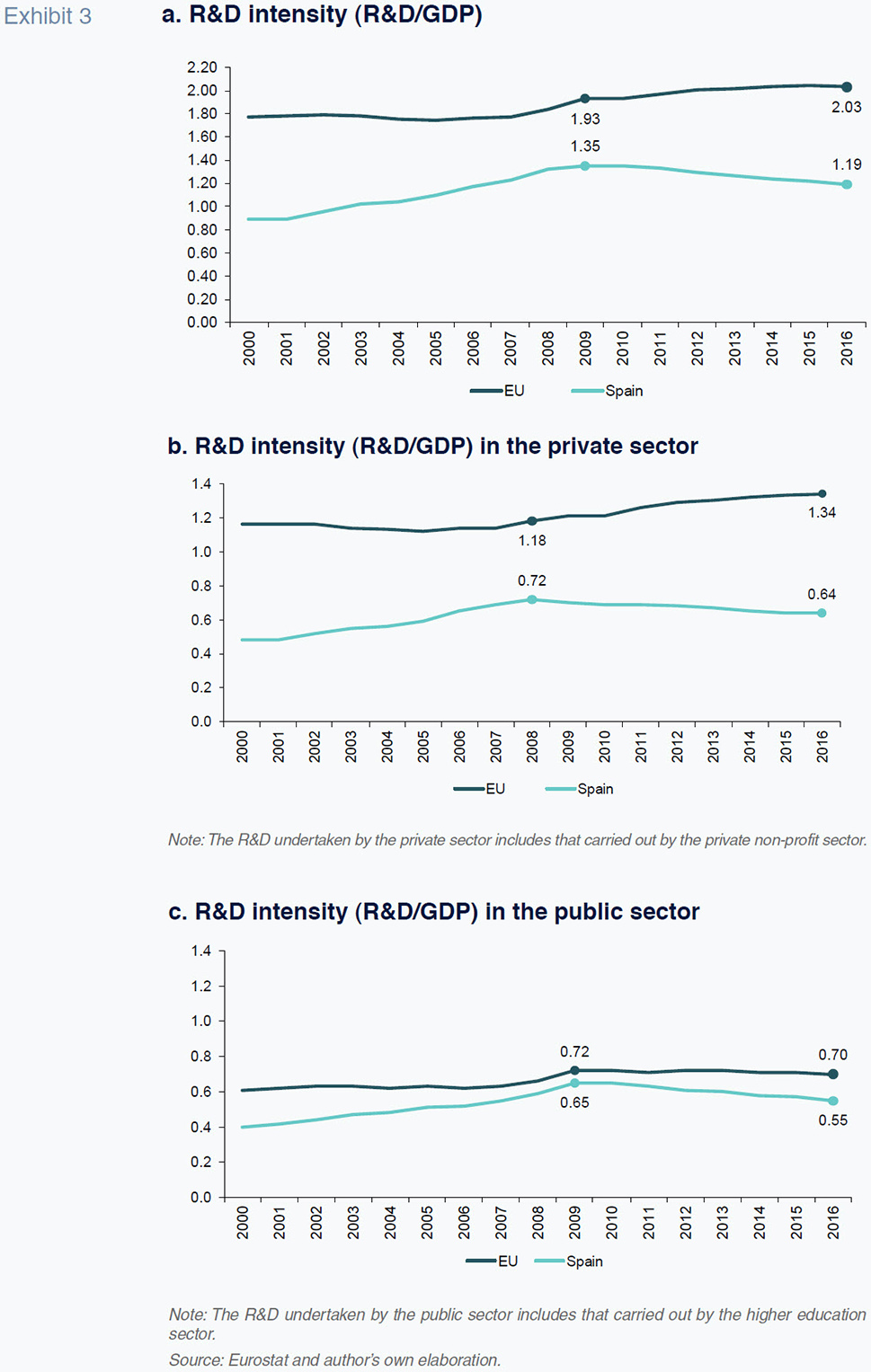 The three exhibits clearly show how Spain converged towards the EU average until 2010, at which time it began diverging. The convergence period was driven by the fact that growth in R&D expenditure was higher during those years in Spain than in the EU as a whole. The divergence after 2010 has been driven by a steady decline in R&D intensity in Spain, a drop that has been more pronounced in the public sector, while intensity continued to increase in the EU as a whole, particularly in the private sector.