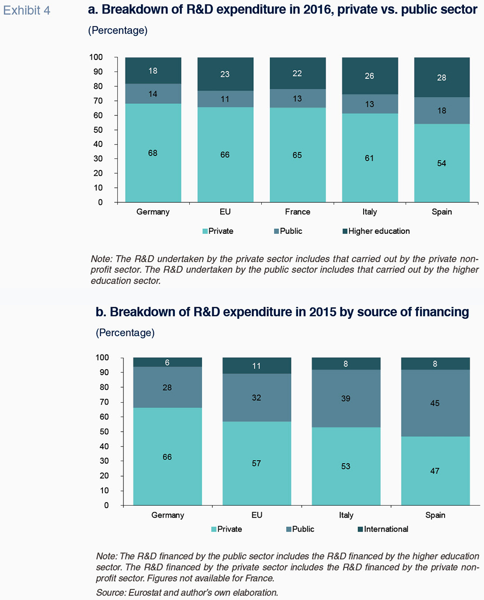 As the exhibits show, in terms of where the money is deployed and, more notably, where it comes from, the contribution by the private sector in Spain is around 10 percentage points below the EU average. In Spain, the amount of financing sourced from the national private sector is less than 50% (47%), while the EU recommends this ratio to be two-thirds of all R&D funding, as indeed is the case in Germany (Exhibit 4.b).