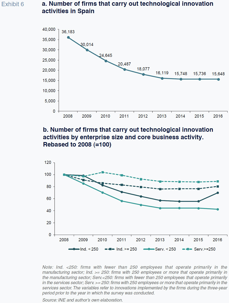 As shown in Exhibit 6.a, the number of enterprises that undertake technological innovation activities fell continuously between 2008 and 2016 (latest data available), such that the number of firms that were active in this field in 2016 was less than half (43%) that of 2008. The loss of innovative firms is most pronounced within the category of enterprises with fewer than 250 employees whose core business is the provision of services. The number of firms in this group, which represent nearly 50% of all the enterprises that undertake technological innovation activities, fell by nearly 60% between 2008 and 2016. This downward trend has been continuous and there are no signs of a turnaround. In contrast, the downward trend for those firms whose core business is manufacturing came to a halt in 2016, a year in which the number of active companies with fewer than 250 employees increased considerably (Exhibit 6.b).
