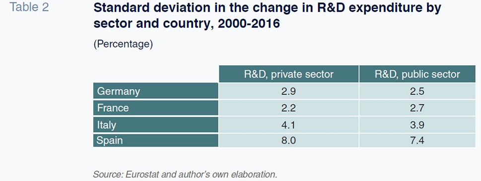 As the exhibits show, the trend in R&D expenditure in Spain has been more volatile in both the private and public arenas than in the three benchmark economies, displaying annual growth rates of as high as 15% or 20% when economic times were buoyant and significant contraction during episodes of crisis. Table 2 provides the standard deviations in the series and confirms that in Spain, the volatility in R&D expenditure for both the public and private sectors is double that of Italy and triple that observed in France and Germany.