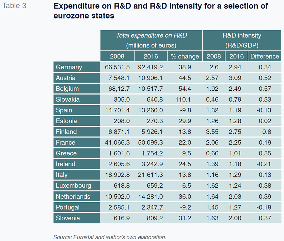 The result is that Spain is one of just three eurozone states in the OECD to have invested less in R&D in 2016 than in 2008 (Table 3).