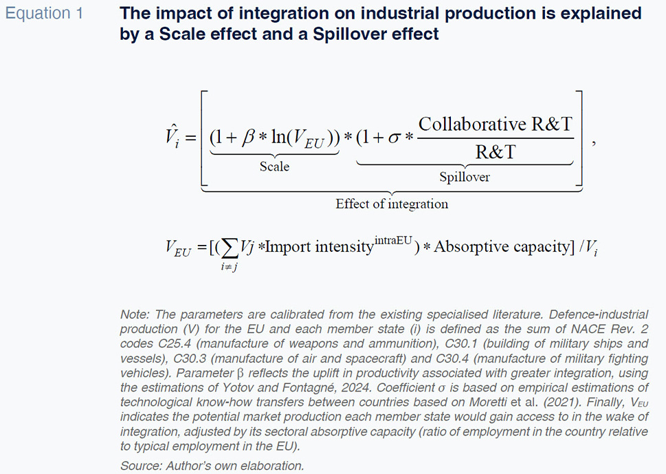 The model (Equation) compares observed production with that which would occur in a scenario of greater European integration
