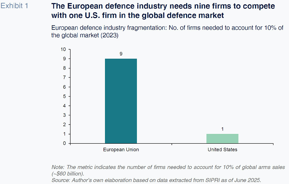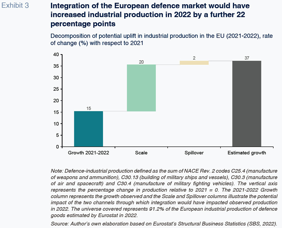 Abstract [1]: The European Union is the second-largest global spender on defence, but its effective military capacity has lagged. The current industrial model, marked by overlapping capabilities, limited economies of scale, and modest levels of collaborative innovation spending, has contributed to high production costs and missed opportunities for technological spillovers. Drawing on a simple modelling exercise, estimates show that full integration of the EU defence market could have raised industrial output by 22 percentage points in 2022 above observed growth, equivalent to roughly €46 billion or 14% of total EU defence spending. Most of the potential gain is tied to scale effects, with a smaller but important share linked to increased knowledge transfers. While countries with larger industrial bases would benefit most in absolute terms, smaller member states would experience stronger relative growth, supporting more balanced development. Unlocking these gains would require addressing long-standing institutional and financial barriers, and ensuring that benefits are distributed equitably across the bloc. At a time of heightened geopolitical pressure, improving industrial coordination offers a credible path to stronger strategic autonomy and more effective defence capacity.