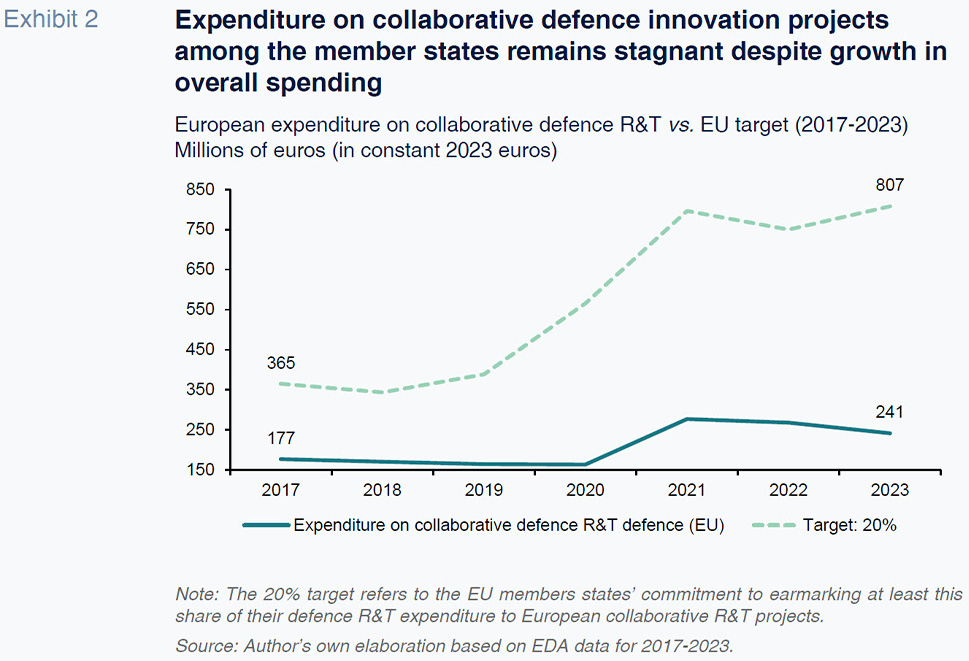 The current limits of the European defence sector restrict the scope for rapid expansion, so reaching the desired production levels will take time (IISS, 2025). In the context of restricted space for fiscal manoeuvre, greater integration and more collaboration around innovation constitute an alternative route for reinforcing the defence-industrial sector.