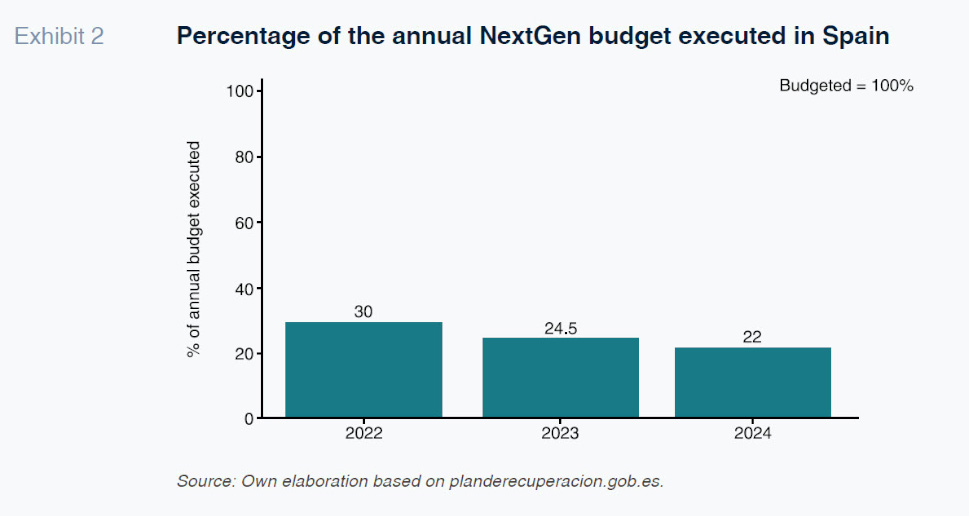 Abstract: Spain has received more than €55 billion in transfers from Next Generation EU, making it one of the EU countries most advanced in terms of formal disbursements approved by Brussels. Yet actual execution lags far behind: in 2024, only €7.5 billion of the €34.1 billion budgeted was disbursed, with less than a third of credits converted into effective payments. Around a quarter of resources have gone to current expenditure, diluting the program’s long-term transformative impact. While Spain has complied with milestones to unlock European disbursements, the funds have too often failed to deliver meaningful structural change. With less than two years left before the 2026 deadline, the challenge is not only to accelerate absorption but also to ensure that investments and reforms deliver a lasting legacy.