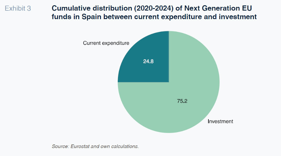 A stated objective of the NGEU was to finance capital expenditure (public investment) rather than current expenditure, in order to ensure a lasting transformative effect. In practice, Spain has allocated a significant portion of the funds to current expenditure (e.g., hiring staff, current transfers, benefits) to shore up public services during the crisis. According to Eurostat data, in the period 2020-2024, Spain allocated approximately €7.877 billion of the €31.821 billion received to current expenditure, i.e. 24.8%. The remaining proportion (75.2%) financed capital expenditure or investments.