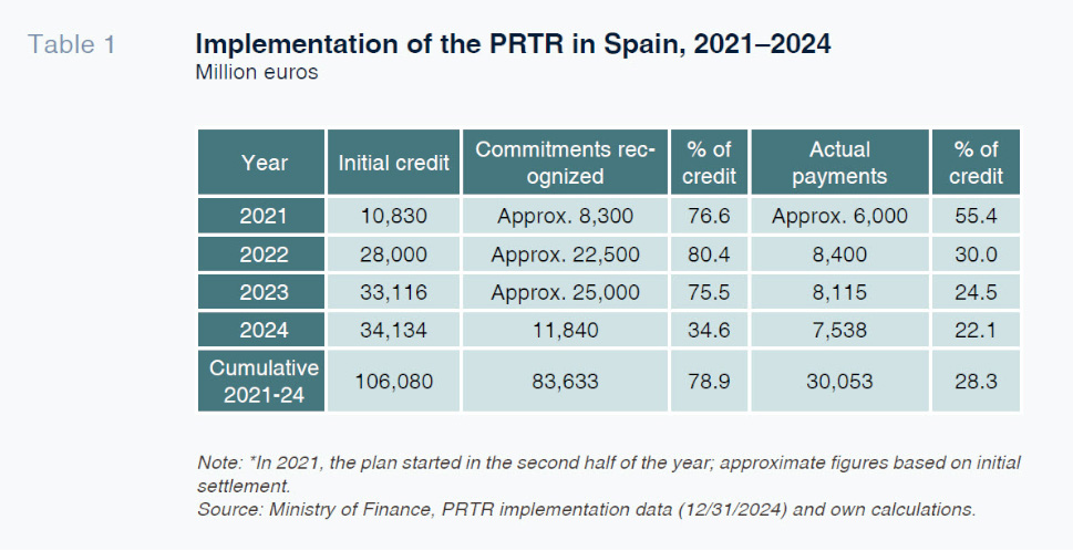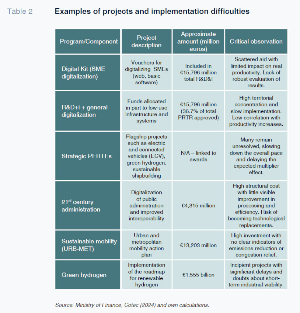 - Issues of absorption and institutional capacity. Experience to date has highlighted shortcomings in the management capacity of administrations, especially at decentralized levels. Spain’s administrative fragmentation complicated the governance of the PRTR. Some autonomous communities have excelled in implementation, but others have delayed calls for proposals or have had to return uncommitted funds.
