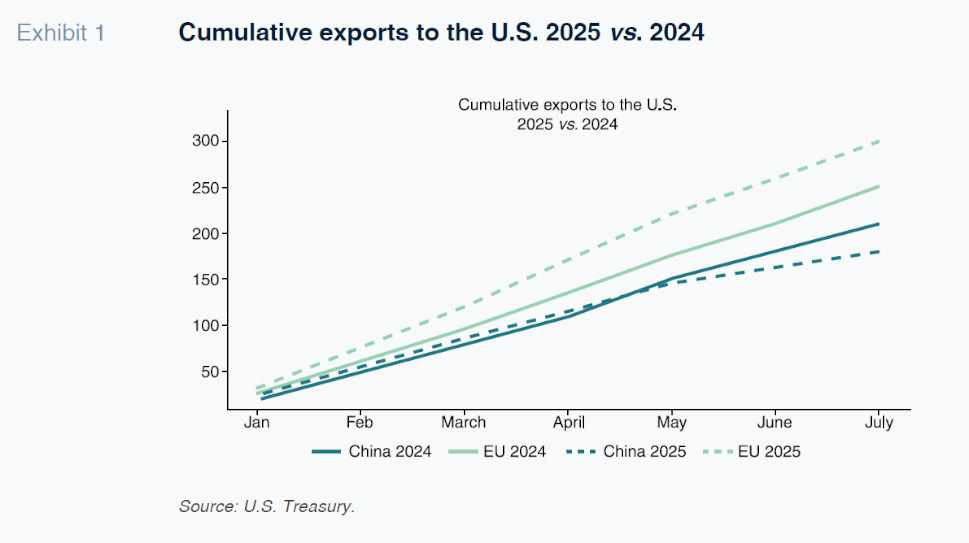 So far, so good. The seemingly earth-shattering ‘reciprocal’ tariffs, announced by U.S. President Trump and then partially implemented since April have had little impact on trade flows so far. U.S. imports have stabilized after the rush in March to beat the tariffs, and the market share of the EU has remained constant, with EU exports to the U.S. up about 40 billion euros during the first semester of this year.