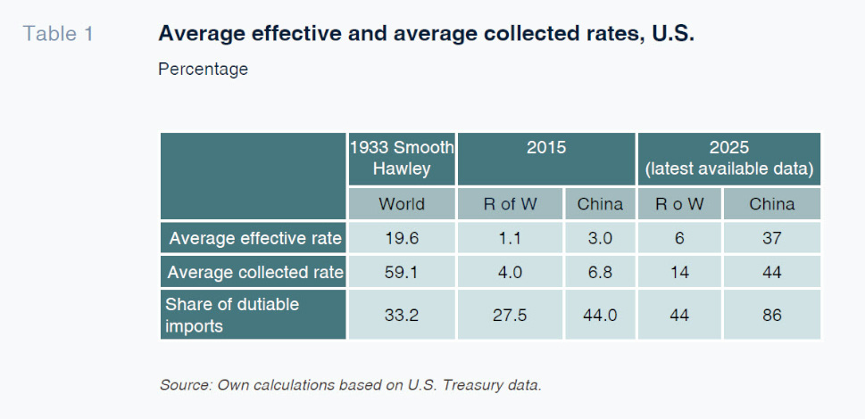 The figures in Table 1 suggest that China is already now facing tariff rates of the same order of magnitude as those of the Smooth Hawley tariffs.