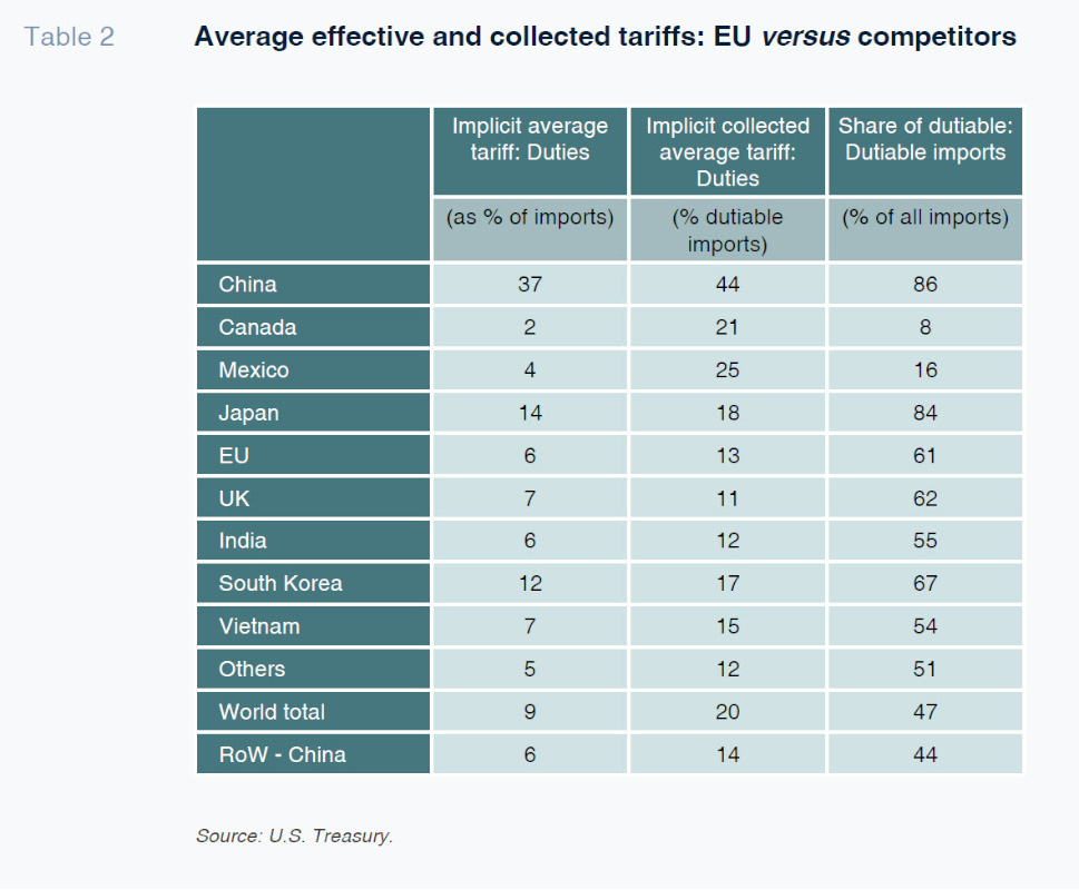 framework agreement” has been widely criticized as a capitulation. But its implementation would only confirm the relatively advantageous position of the EU in terms of access to the U.S. market, as the tariff rates facing EU exporters remain far below those of China and also slightly below those facing other Asian competitors, such as Korea or Japan. Only Canada and Mexico are in a significantly better position than the EU because most of their exports to the U.S. remain still duty free. But these two economies are too small to constitute significant competitors.