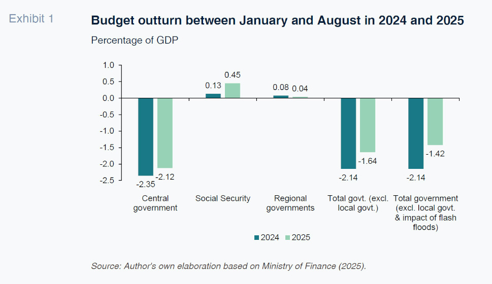 Abstract: Spain’s central government remains mired in budgetary paralysis, with the 2023 General State Budget still in force and no new draft budget likely to pass given the current political fragmentation. Nevertheless, fiscal performance in 2025 has been encouraging: as of August, the deficit fell by half a percentage point of GDP, driven by a 10% increase in tax revenue, outpacing nominal GDP growth. The improvement stems largely from favourable cyclical conditions, including strong job creation and the expiration of temporary tax relief. Looking ahead, AIReF and the Bank of Spain expect further fiscal consolidation in 2026, projecting deficits of 2.0%–2.3% and a debt ratio near 100% of GDP. However, underlying structural imbalances remain, and most of the deficit reduction has been cyclical rather than permanent. From 2027 onwards, Spain will likely face pressure to curb expenditure growth and introduce structural reforms to comply with new EU fiscal rules. Sustaining fiscal discipline amid political uncertainty will require difficult choices, particularly in defence, housing, and public investment.
