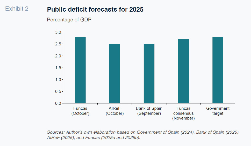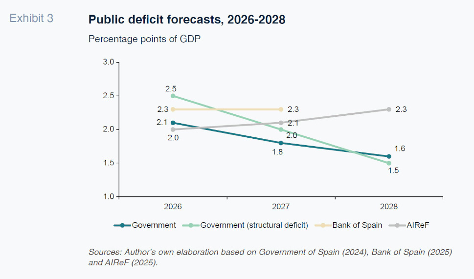 Despite the uncertainty around the fate of the 2026-GSB and the scarcity of official budget strategy documents in 2025, both AIReF (2025) and the Bank of Spain (2025) agree that the public deficit will come down further as a percentage of GDP in 2026 (Exhibit 3). The former is forecasting a reduction in the total deficit to 2% of GDP, while the central bank is estimating a deficit of 2.3%. The government’s target as per the MTFSP 2025-2028 falls in the middle (2.1%). [2]