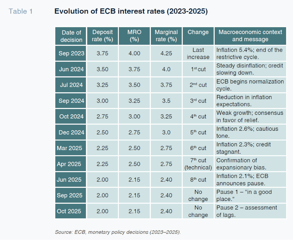 In just over three years, the European Central Bank’s monetary policy has gone from the most intense tightening in its recent history to a prolonged and calculated sequence of cuts. After raising the deposit rate to 3.75% in 2023 to contain an inflationary outbreak that threatened to unanchor expectations, the Governing Council embarked on a normalization process in 2024 that reduced rates eight consecutive times by 25 basis points, bringing them to 2.00% in June 2025. With this, the ECB brought an end to a period of extraordinarily restrictive policy and entered a phase of fine-tuning, aware that the transmission of its decisions had become more complex and non-linear.