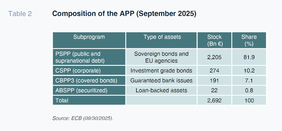 The process has involved a change in the operating regime. For almost a decade, European monetary policy was based on balance sheet expansion and abundant reserves. Now, the ECB is seeking to reintroduce relative scarcity into the system to restore the role of the deposit rate as an effective market benchmark. From its peak in 2022, the total volume of assets purchased has fallen from just over €3.2 trillion to €2.69 trillion in September 2025, with a reduction rate of around €30 billion per month.