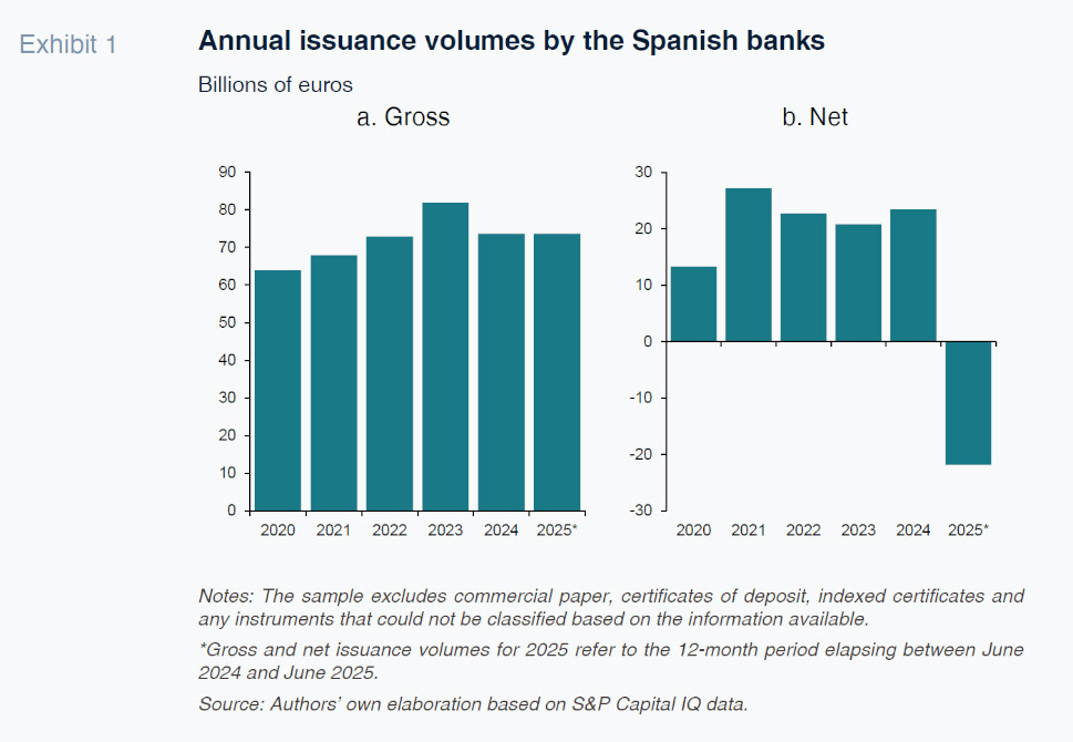 Exhibit 1a shows how the Spanish banks have issued fixed-income instruments very intensely during the period analysed, within a range of between 64 and 82 billion euros, with peak issuance taking place in 2023. [1] This gross issuance volume contrasts with the net volume, which is far smaller, at around 13 to 27 billion euros per year, with the net balance even turning negative in the last 12 months (Exhibit 1b). The marked difference between the two metrics reflects the significant volume of debt falling due and the banks’ active refinancing policies.