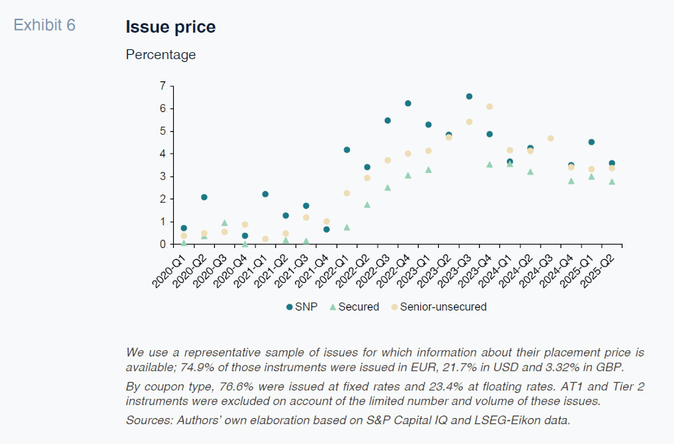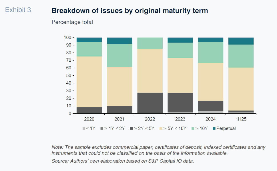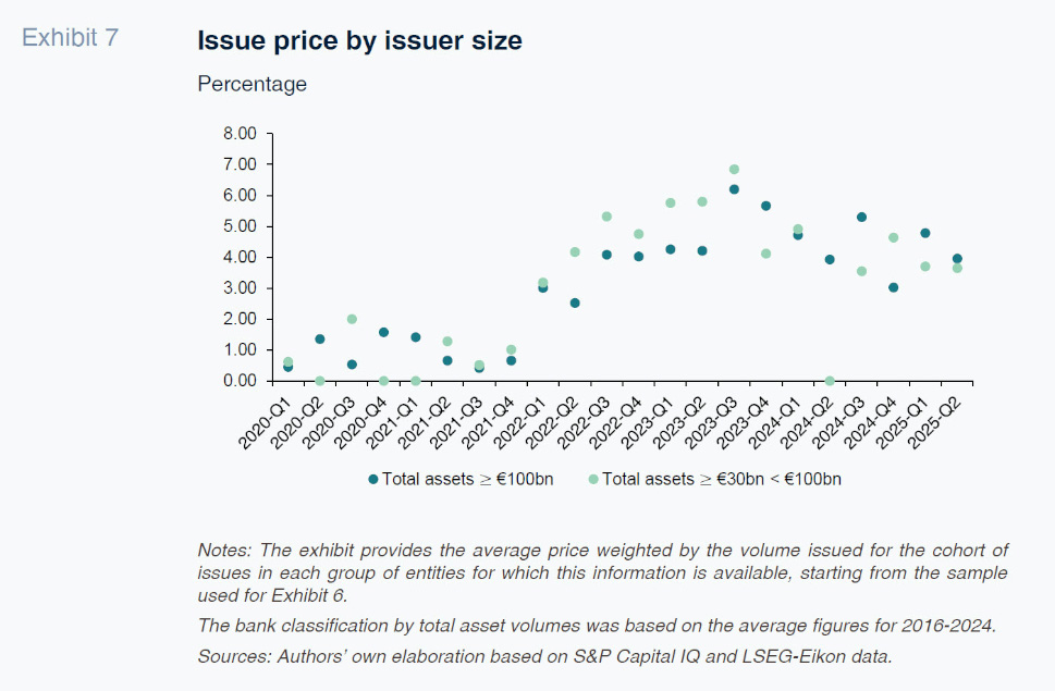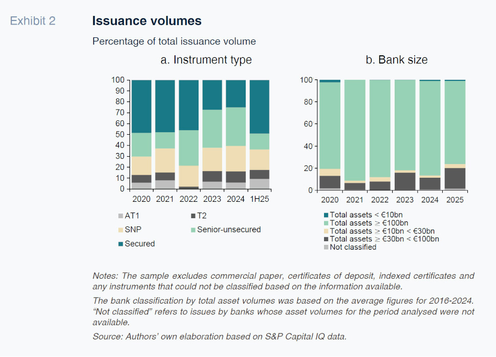As for issuers, in recent years the market has been characterised by the gradual incorporation of smaller-sized banks, particularly mid-sized banks (between 30 and 100 billion euros of assets). This trend consolidated during the first half of 2025, when mid-size banks accounted for 19% of total issuance volumes, with the cohort of banks with under 100 billion euros of assets representing 25% of the total (Exhibit 2b).