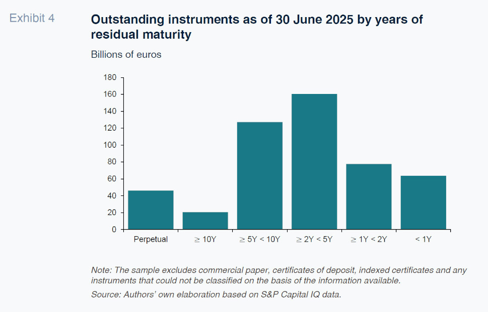 In the first half of 2025, this preference for longer-dated paper intensified, in keeping with the environment of lower coupons and an absence of any particular pressure at the long end of the curve. More specifically, the weights of instruments maturing between 5 and 10 years and those falling due in more than 10 years both increased and there was an uptick in perpetual bonds. In tandem, the issuance of paper due within 2 to 5 years decreased, as did that dated less than one year, albeit by proportionately less. This trend suggests that the banks are taking advantage of the current favourable borrowing terms and conditions to lock in costs for the long term out of concern that geopolitical and trade-related uncertainty could potentially push rates higher. This pattern may also be related with a financial structure management strategy, particularly considering that 61% of the outstanding balance falls due within the next five years, with 87% doing so before 2035, increasing the medium-term refinancing requirement (Exhibit 4).