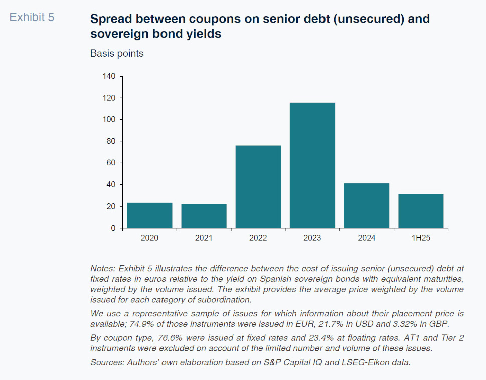 Firstly, the spread between bank bonds (specifically unsecured paper) and Spanish sovereign bonds has decreased considerably since 2024 to around 30 basis points in the first half of 2025, which is down 84 basis points from 2023 (Exhibit 5).