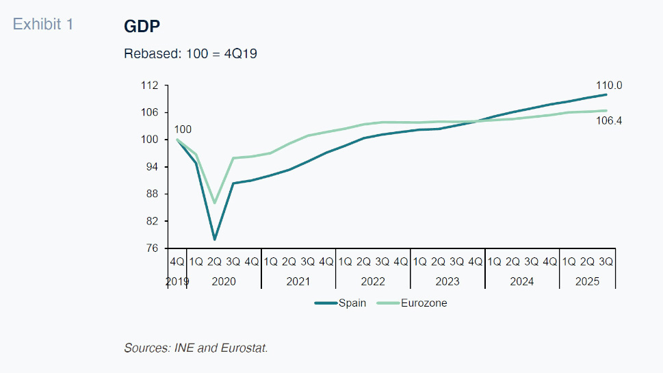 The Spanish economy remains on a clear-cut growth trajectory. Following the INE’s most recent statistical revisions (which yielded an upward adjustment to the growth accumulated in the post-pandemic era), Spanish GDP is now 10% above its pre-pandemic level, compared to an average of 6.4% for the eurozone as a whole (Exhibit 1).