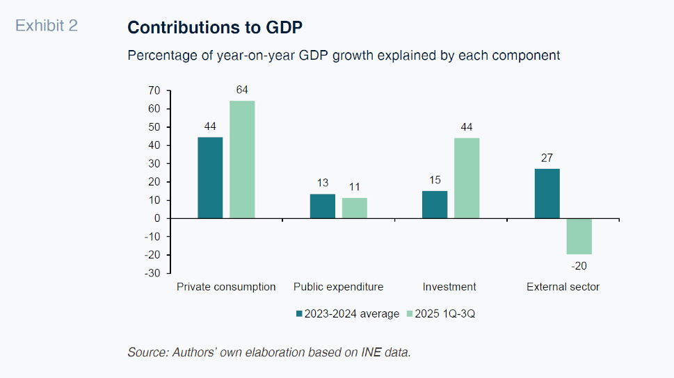 In any case, investment in the bulk of the business sector remains worryingly weak, with only certain (transitory) public assistance targeted at digitalisation providing partial relief. This is evident in the breakdown between investment in the public and private sectors: whereas real GFCF in the public sector was 43% above 2019 levels by June 2025, investment by non-financial corporations (NFCs) continued to lag that same benchmark by 5% (also in inflation-adjusted terms), according to Funcas estimates.