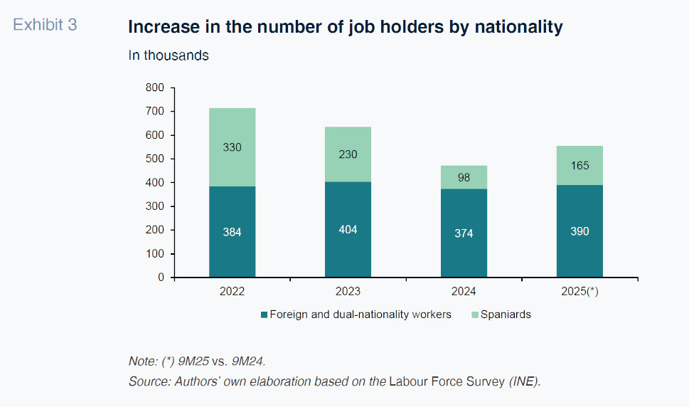 Three key factors underpin the prevailing domestic demand dynamic. First, immigration is enlivening activity in labour-intensive sectors such as construction and hospitality, while contributing to growth in private consumption. By 1 July 2025, the number of immigrants had increased by 602,000 from a year earlier, marking sharp growth, in line with that of the previous three years. According to the Labour Force Survey, 65% of all the net new jobs created between 2022 and 2025 have been taken up by foreign-born or dual-nationality workers (Exhibit 3). In certain sectors, where it is proving harder to find labour, the participation of foreign workers has been even higher. For example, in the restaurant sector, personal, protective and sales services, and in construction, the percentage of newly created jobs held by foreign-born or dual-nationality workers exceeds 80%.