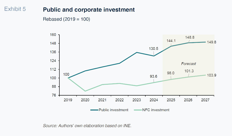 Thirdly, the need to execute the European funds before the end of the Next Generation (NGEU) programme is fuelling growth in investment (GFCF). In fact, one of the biggest differences in the national accounting statistics for 2022 to 2024 derived from the recent statistical revisions has been a significant increase in GFCF compared to the previously published figures. The adjustment was concentrated in the two components most likely to have benefitted from the European funds: non-residential construction (including civil infrastructure, among other things) and intellectual property products, an area that very probably includes the European funds being channelled into digital transformation.