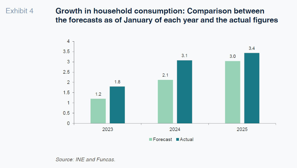 As for the upside, household consumption could increase by more than we are forecasting. Indeed, in recent years, private consumption has proven consistently stronger than anticipated. Between 2023-2025, it registered real growth of 8.5%, topping our forecasts every year (Exhibit 4). The deviations with respect to our forecasts were shaped by (i) higher than expected growth in consumption per capita; and (ii) higher than forecast population growth. The higher growth in consumption per capita was in turn the result of higher than expected growth in gross disposable income, in spite of the fact that the savings rate came in higher than planned.