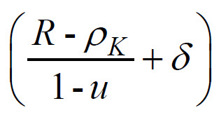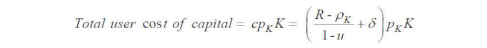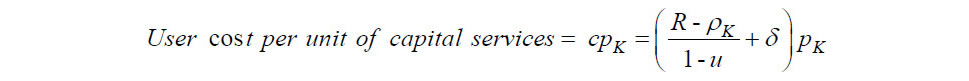 Where pK is the current market price per unit of capital service, R is the nominal annual after-tax return per euro of financing in alternative investments with similar risk to that of the corporation, pK=ṗK , which is the annual rate of change in the price per unit of capital service. δ is the annual rate of depreciation of the stock of capital over a one-year period of usage, u is the rate of tax levied on corporate profits, and K is the stock of capital service units.