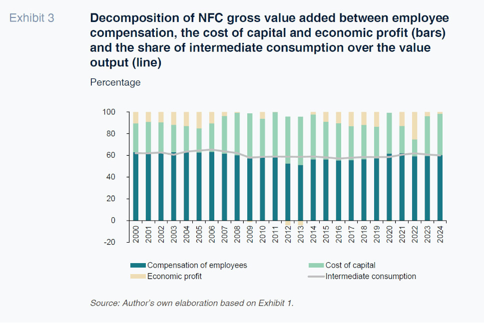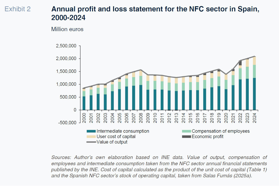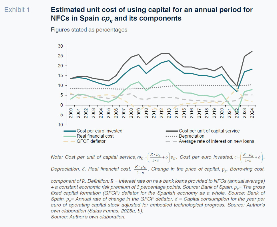 K. The source of the estimated stock of capital of Spain’s NFCs is Salas Fumás (2025b). The unit cost calculation is summarised in Exhibit 1.