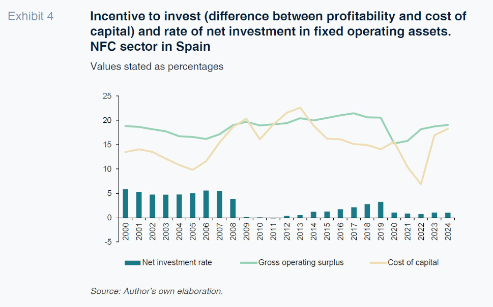 Abstract: Spanish non-financial corporations generated modest economic profits averaging 3% of output over 2000–2024, though profits fell near zero during the 2009–2013 crisis and remained weak after the pandemic. Corporate investment mirrored these economic profits, rising when returns exceeded capital costs and stalling when profits were insufficient, even as output and employment recovered. Over the period examined, firms shifted from buying intermediate goods toward internal production, increasing the share of value added and producing more capital-intensive goods. This structural shift amplified the lag between growth in output and employment and the pace of investment, as firms prioritized profitability over rapid expansion of capacity. Accounting profits masked these dynamics, offering a misleading signal of incentives to invest. The patterns suggest that slow investment in recent years reflects rational adjustments to economic returns rather than widespread financial constraints, highlighting the importance of measuring opportunity costs alongside traditional profit metrics.