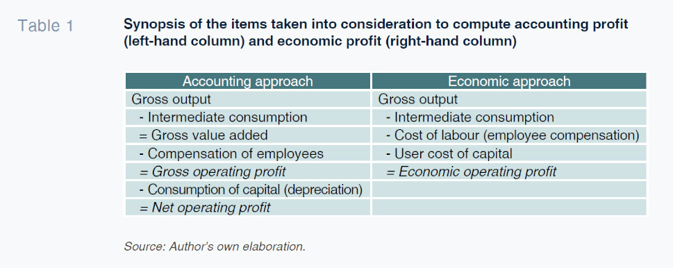 The calculation of the accounting and economic profit generated by the production of goods and services for sale in the market, which is then applied to the estimate of NFC profits in Spain, is summarised in Table 1.