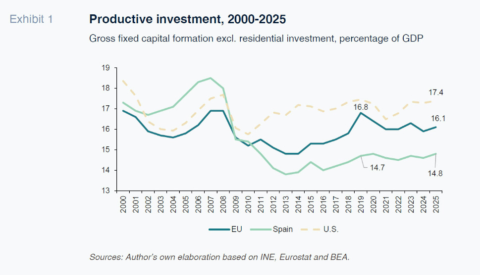 In the case of Spain, high economic growth coupled with the availability of a massive volume of European funds and the downtrend in interest rates, have created a climate ripe for investment. So far, however, the results are falling short of expectations (Torres et al., 2025). The goal of this paper is, on the basis of an analysis of the most recent trends, to look at some of the macroeconomic factors that may be shaping the current investment cycle.