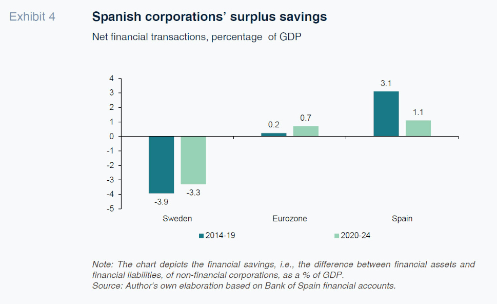 The most plausible explanation behind weak private investment lies with uncertainty and its corollary, namely surplus corporate savings. Indeed, the non-financial corporations have registered an uninterrupted net lending position since the real estate bubble burst rather than a borrowing requirement, as might be expected due to the very nature of corporate activity, which is to use external capital to finance growth. That surplus has been oscillating at between 10% and 20% of disposable income. Other European countries have similarly been recording a surplus, albeit generally of a lower magnitude (Exhibit 4). In economies like Sweden and the U.S., companies are tapping the markets to top up the savings generated, evidencing higher confidence in the future.