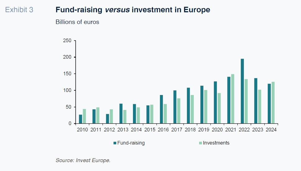In parallel, over the past decade, Europe has been enjoying a cycle of sharp growth in private equity, which has emerged as one of the main sources of financing for corporate growth. Private equity fund-raising doubled between 2014 and 2024, to around 120 billion euros, locking in investment capacity for the years to come.