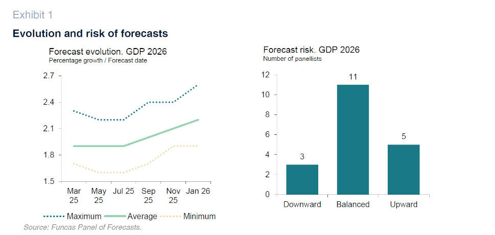 The consensus is that the Spanish economy registered growth of 2.9% in 2025, as also anticipated in the November survey. Domestic demand is thought to have contributed 3.4 percentage points to GDP growth (up 0.1pp from the November consensus forecast), with foreign demand detracting by 0.5 percentage points (versus -0.4pp in November). Investment and its main components are now believed to have performed better, with the public and private consumption forecasts unchanged. Within the foreign sector, the forecast growth in exports has been revised downwards by 0.1 percentage points, while growth in imports has been adjusted upwards by 0.3 points (Table 1).