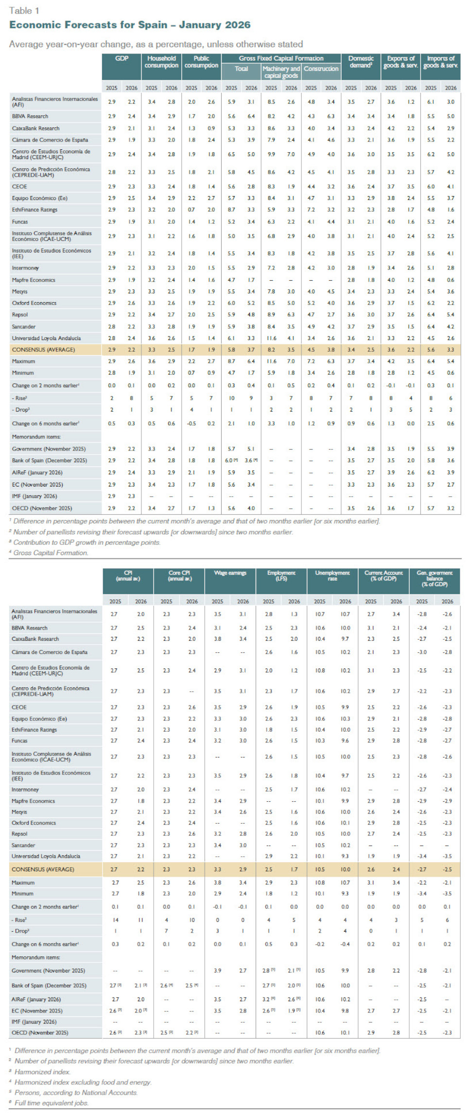 The consensus forecast is for a deficit of 2.7% in 2025 (unchanged from November) and of 2.5% in 2026 (compared to 2.6% in November). The forecast 2026 deficit is above the levels currently forecast by the Spanish government, Bank of Spain, OECD or European Commission (Table 1).