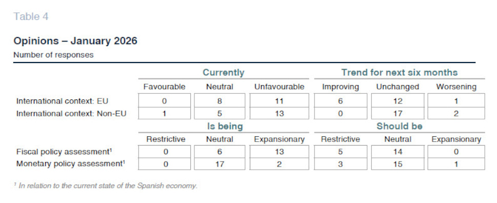 Domestic demand is expected to contribute 2.5 points of that growth (up 0.2pp from the November survey), while the foreign sector is expected to detract 0.3 points. The slowdown by comparison with 2025 stems from investment (especially investment in machinery and equipment) and, to a lesser degree, household consumption. Although public consumption is forecast to continue to drag on growth, it is expected to do so by less than in 2025 (Table 1).