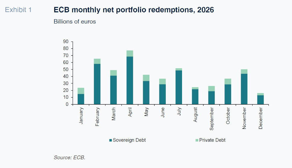 The expectation is that the ECB will return another €420 billion in sovereign debt from those two programmes to the market in 2026 – with €250 billion running off the large-scale asset programme and the rest coming from the pandemic emergency programme (See Exhibit 1). This is on top of €80 billion in private assets that will be allowed to mature on both sets of accounts. [6] These numbers are important, but the expectation is that actors in the private sector will make good use of the sovereign debt instruments that are released. Much will be reabsorbed for use as collateral both in routine treasury operations made by financial and non-financial institutions and eventually with the ECB. This transition is part of a strategy for the ECB’s Governing Council to wean financial institutions off their dependence on central banks to meet their regulatory liquidity requirements and provide a buffer of excess liquidity.