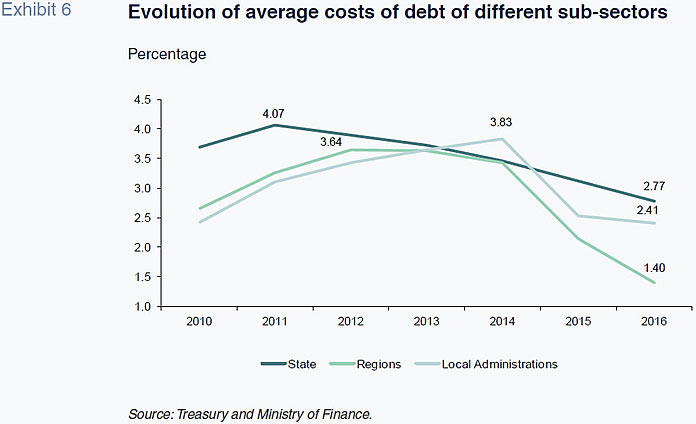 [1] fell from 3.64% in 2012 to 1.40% at the end of 2016, and from 3.83% in 2014 to 2.41% in 2016 for local administrations. While it is to be excepted that the general evolution of funding costs would be similar for both sub-sectors, the reduction in regional financing costs is particularly notable since autonomous regions are now funding themselves at nearly half the cost of the Treasury.