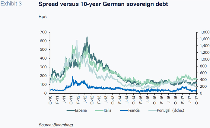 The measures implemented by the ECB have not only led to a reduction in risk-free rates but also in credit spreads, spurring a substantial reduction in financing costs in peripheral economies. While Spanish and Italian 10-year sovereign debt traded at yields of over 7% at the height of the uncertainty in 2012, over the last two years, equivalent-tenor debt has been trading at 1.50% and 1.75% respectively. The reduction has been equally significant in Portugal with the credit spread relative to the German Bund now below 200bps. The reduction in the financing costs of peripheral economies has been crucial to alleviating concerns around the sustainability of public debt in these countries, which were further accentuated by the sharp spike in debt-to-GDP ratios.