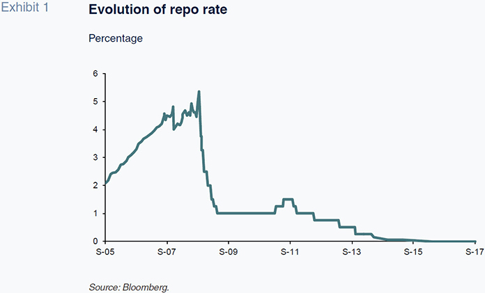 However, the ECB’s Governing Council meeting on January 2015 marked a turning point. The ECB announced that it would launch a programme of public debt purchases through the PSPP (Public Sector Purchase Programme) in response to a continued deterioration in inflation expectations despite implementing the above-mentioned measures. These purchases are not being sterilised, and are swelling the ECB’s balance sheet to over 1.7 trillion euros by October 2017. The measures have also had a concurrent and notable impact on the euro area’s risk-free interest rate, pushing down rates on a two-year interest rate swap (IRS) to negative territory from October 2015 onwards and driving down equivalent German sovereign debt to around -1%.