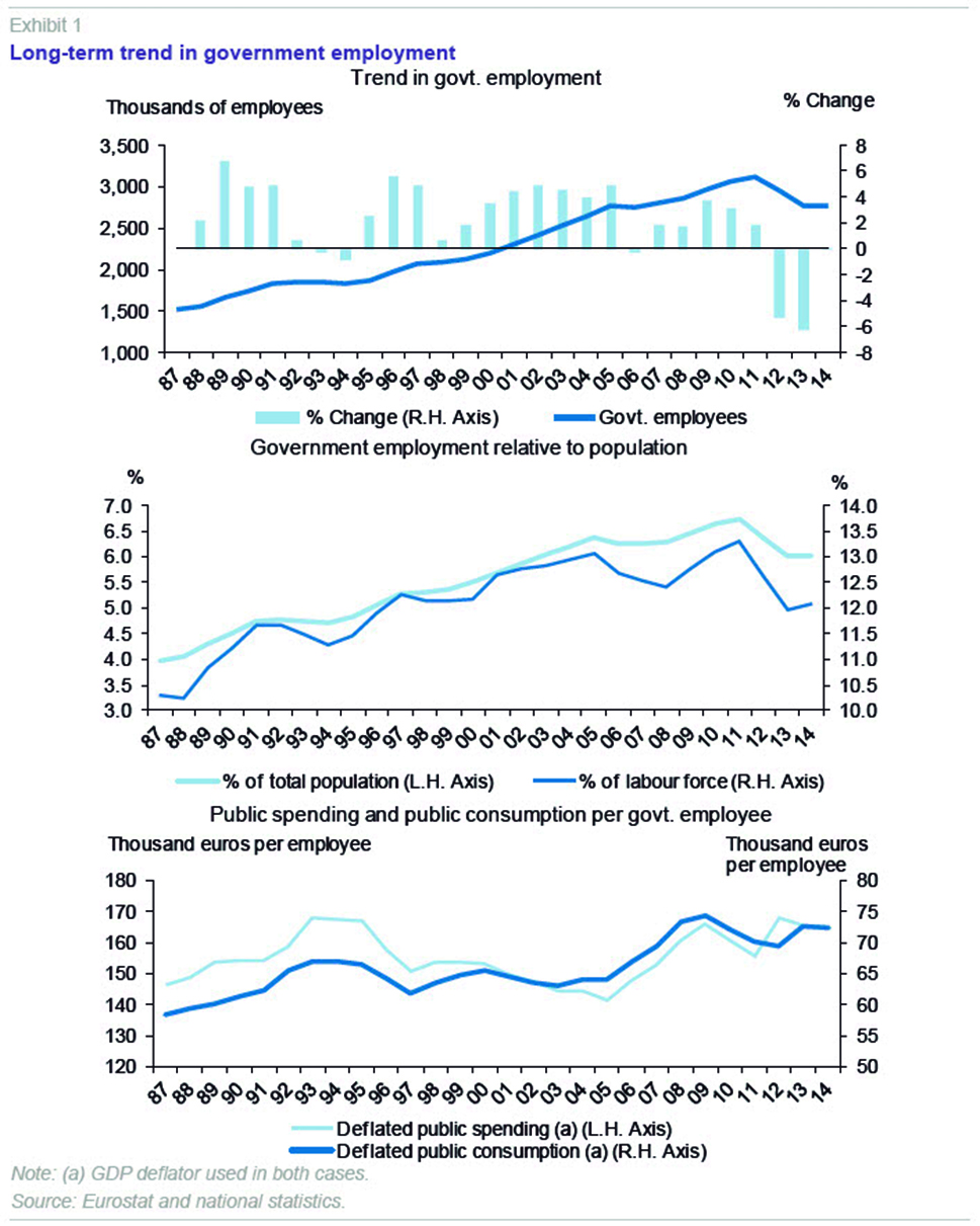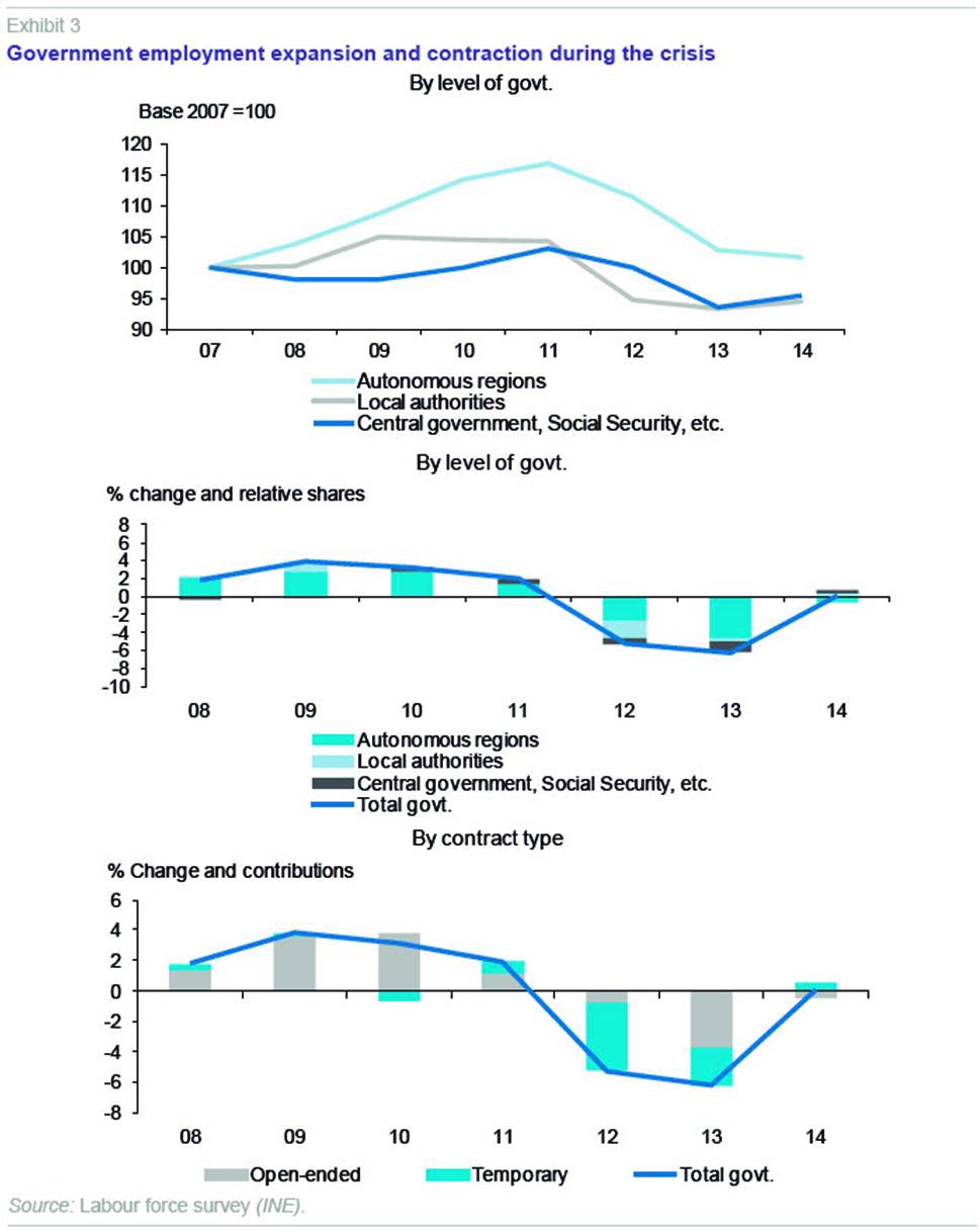 [4] over the course of the crisis and the recent process of fiscal consolidation. Our analysis of this process focuses in particular on the changes in the structure and composition of public-sector employment broken down by level of government, type of contract, and branch of activity. We also present evidence on the role the various measures approved to correct the government deficit may have played, particularly since 2011. The article does not, however, address other important issues, such as the links between government employment and the efficiency with which public goods and services are delivered. Nor does it discuss the public or private provisions of public goods and services, or the evaluation of the observed or desirable design of government salary and staff policies. There is abundant specialised literature focusing on analysing public sector efficiency, the management of public sector employment, and the broader question of the “quality of public expenditure” in general. See, for example, López Casasnovas (2010), González Páramo and Onrubia (2003), Afonso, Schuknecht and Tanzi (2005) or Hernández de Cos and Pérez (2015).