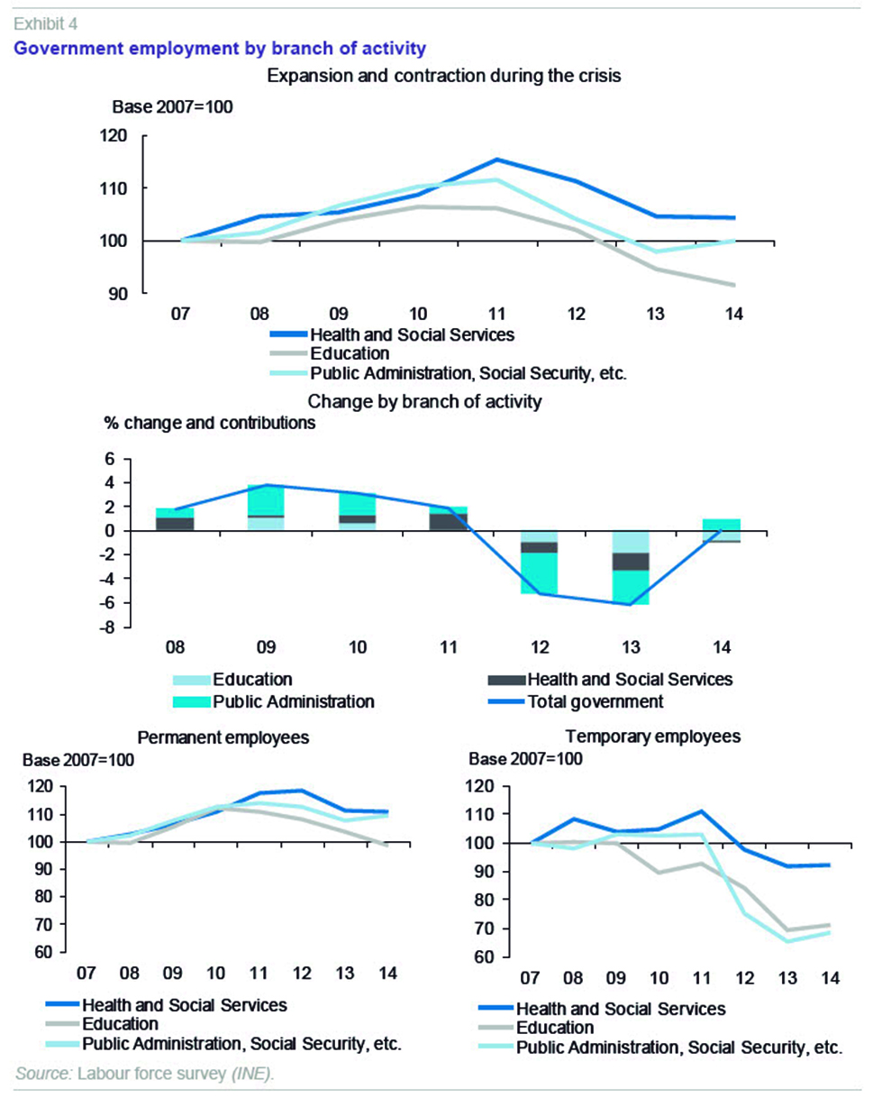 By sectors of activity, public-sector employment as a whole in all branches (education, health and social services, public administration and Social Security) fell in 2012 and 2013 (see Exhibit 4).