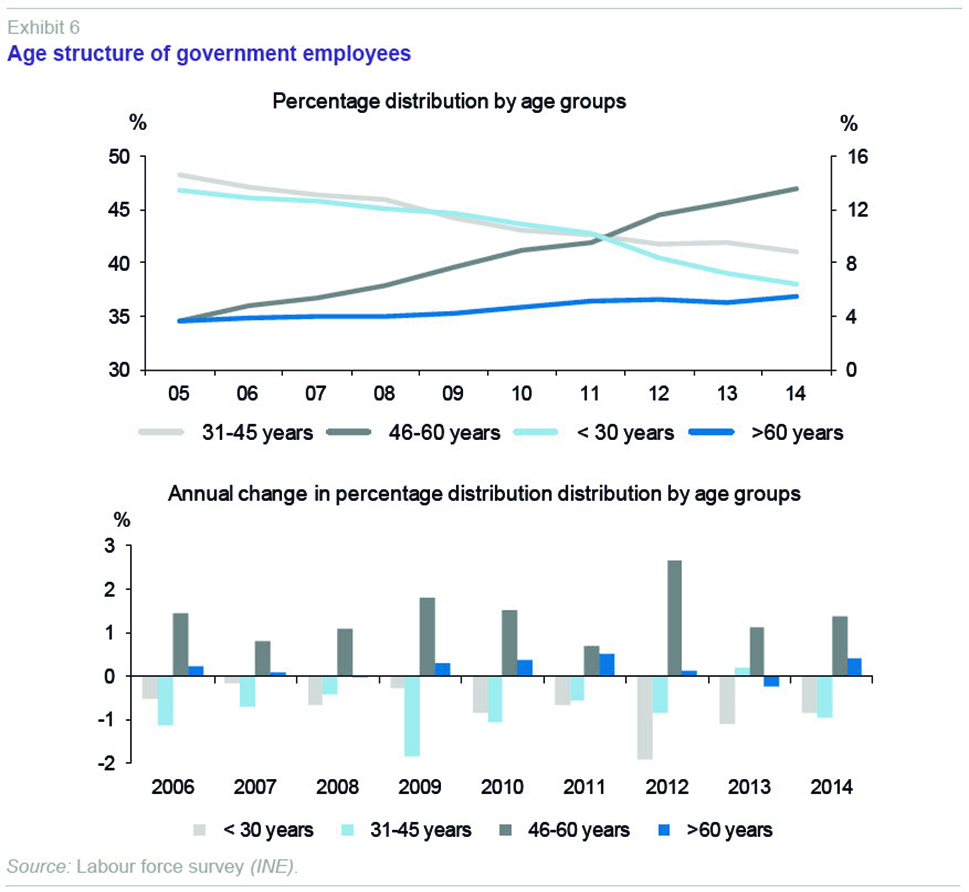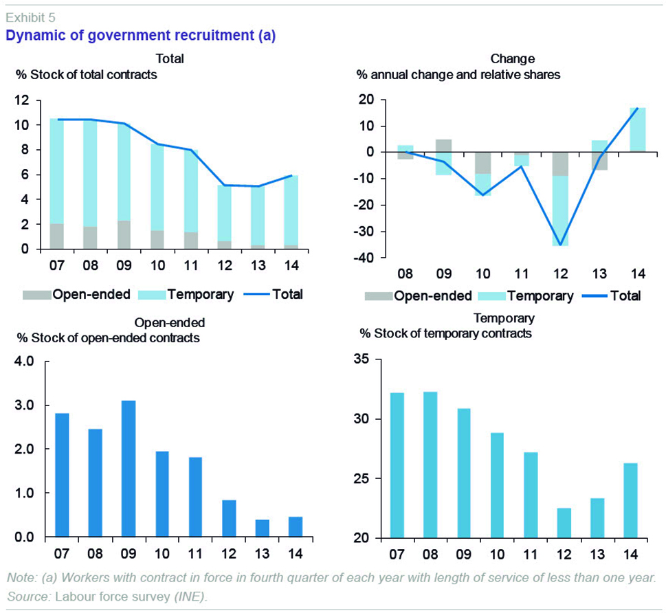 The number of employees in the last quarter of each year who have been working for the government for less than 12 months was used as a proxy for government recruitment (see Exhibit 5). The share of the total these new contracts represent in the fourth quarter has declined considerably since 2010, in the case of both open-ended and temporary contracts. This trend gained pace in 2012, with a year-on-year drop of more than 35%. In 2013 and 2014, on the other hand, recruitment of temporary workers recovered, while the number of new open-ended contracts fell in 2013 and remained stable in 2014.