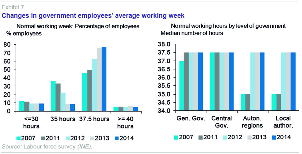 These measures have had a visible impact on the normal working hours of public-sector employees, where there has been a genuine change in the working week from thirty-five to thirty-seven and a half hours (see Exhibit 7). The number of employees with a normal working week of thirty-seven and a half hours represented approximately 45% of total in 2007. This share rose to 75% in 2014, while the share of employees with a normal working week of thirty-five hours has fallen from 36.1% in 2008 to 8.6% in 2014. These changes have affected employees on both open-ended contracts and temporary contracts. Broken down by levels of government, the normal working hours at the central government level were already thirty-seven and a half hours before the crisis, while the autonomous regions and local authorities have converged to this figure since 2012.