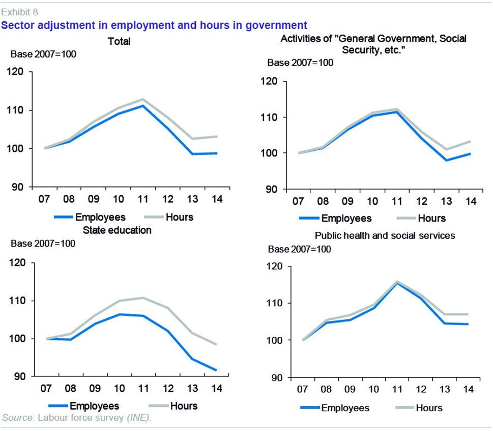 The increase in the number of hours per worker has made it possible to mitigate the effects of the reduction in the total number of government employees observed in 2012 and 2013 (see Exhibit 8). Thus, the total number of hours worked by government employees in 2007-2014 (calculated as the number of hours worked per employee multiplied by the number of employees) has remained above 2007 levels, although between 2011 and 2013 it dropped by 9.1%, and then remained fairly stable in 2014. By sectors, the effect has been particularly significant in public education, given that the total number of hours worked by employees in the sector was 1.6% less in 2014 than in 2007, a significantly smaller drop than the 8.5% reduction in the number of employees.