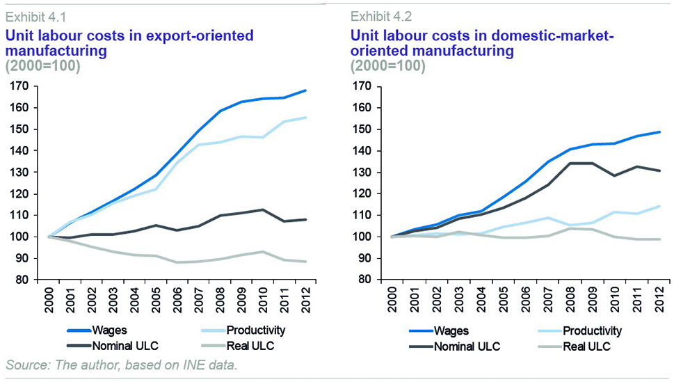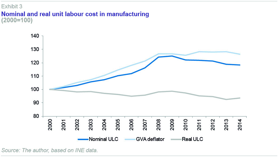 Nevertheless, during the growth phase, the prices charged by the manufacturing industry, measured by the variation in the sectoral GVA deflator, grew even faster than ULCs: 21.3% between 2000 and 2007, compared with the 16.2% growth in ULCs already mentioned (Exhibit 3). In other words, despite strong growth in nominal ULCs, in real terms, ULCs fell during the period, as the prices charged by firms rose faster. This implies that during this period, business’s profit margins rose despite the loss of cost competitiveness relative to the euro area.