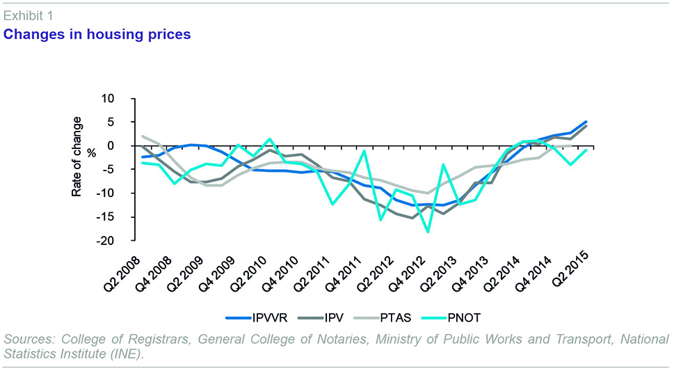 [1] the IPV (INE house price index) shows a slightly more moderate picture, although with a rise of 4.2% at the end of June. The Ministry of Public Works and Transport’s appraisals price index (PTAS) shows a complete stabilisation during two quarters and a small increase (1.2%) in the second quarter of 2015. It is worth noting that unlike the situation during the property boom, when valuations were inflated due to the perverse incentives in mortgage financing (Montalvo and Raya, 2012), decrees enacted in 2012 placed restrictions on the ownership of appraisal companies, causing the opposite to happen, and valuations now tend to underestimate the value of real estate collateral. Lastly, the General College of Notaries’ price index (PNOT) continues to register a drop, albeit a moderate one.